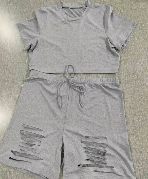 Plus Size Solid Two-Piece Set, Crew Neck Short Sleeve Top and Cut Out Shorts Outfits Women's Plus Size Clothing